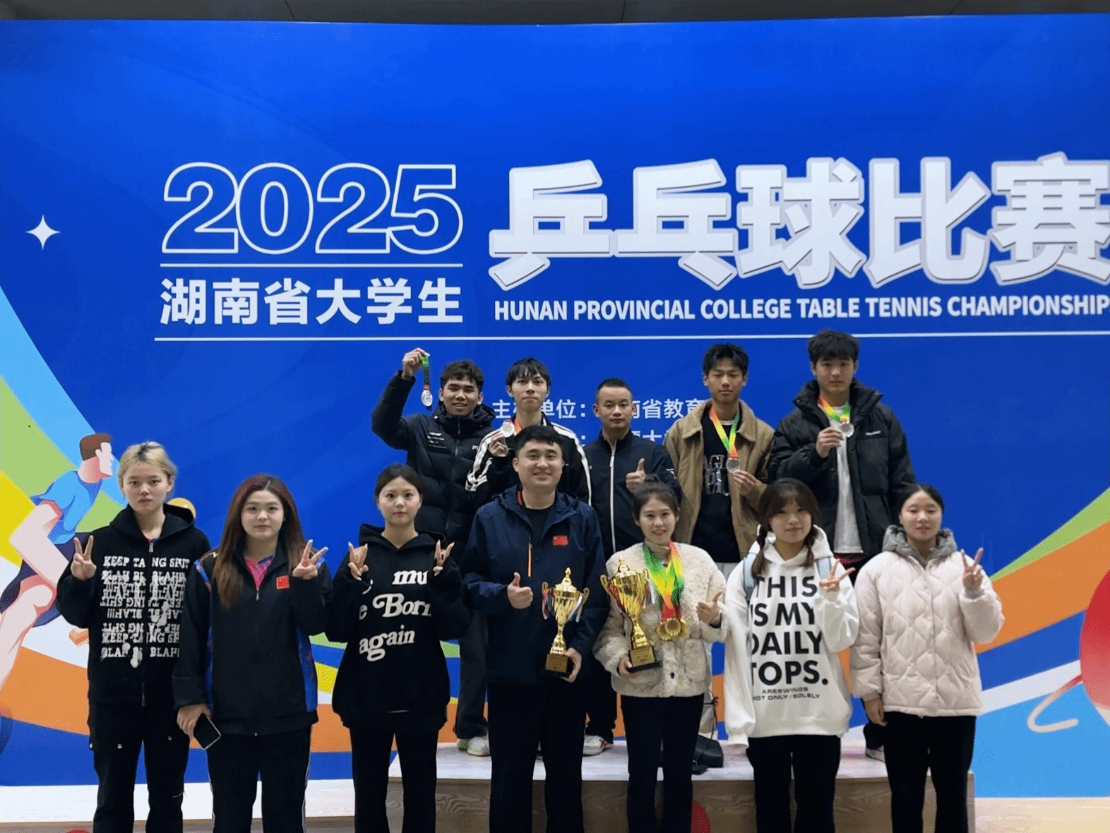 在刚刚落幕的2025年湖南省大学生乒乓球比赛上,我校乒乓球队奋勇拼搏,发挥出色,在竞争激烈的学院乙组中,一举夺得3枚金牌(女子团体、女子双打、男子单打)、4枚银牌(男子团体、女子双打、混合双打、女子单打)的优异成绩,展现出强大的整体实力和昂扬的精神风貌。