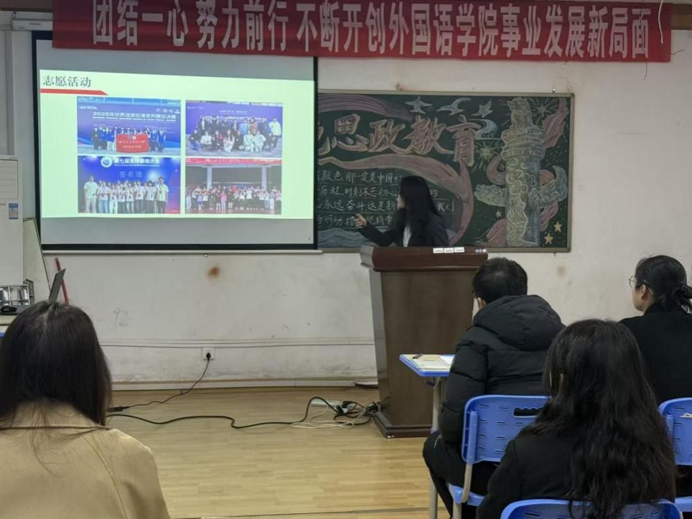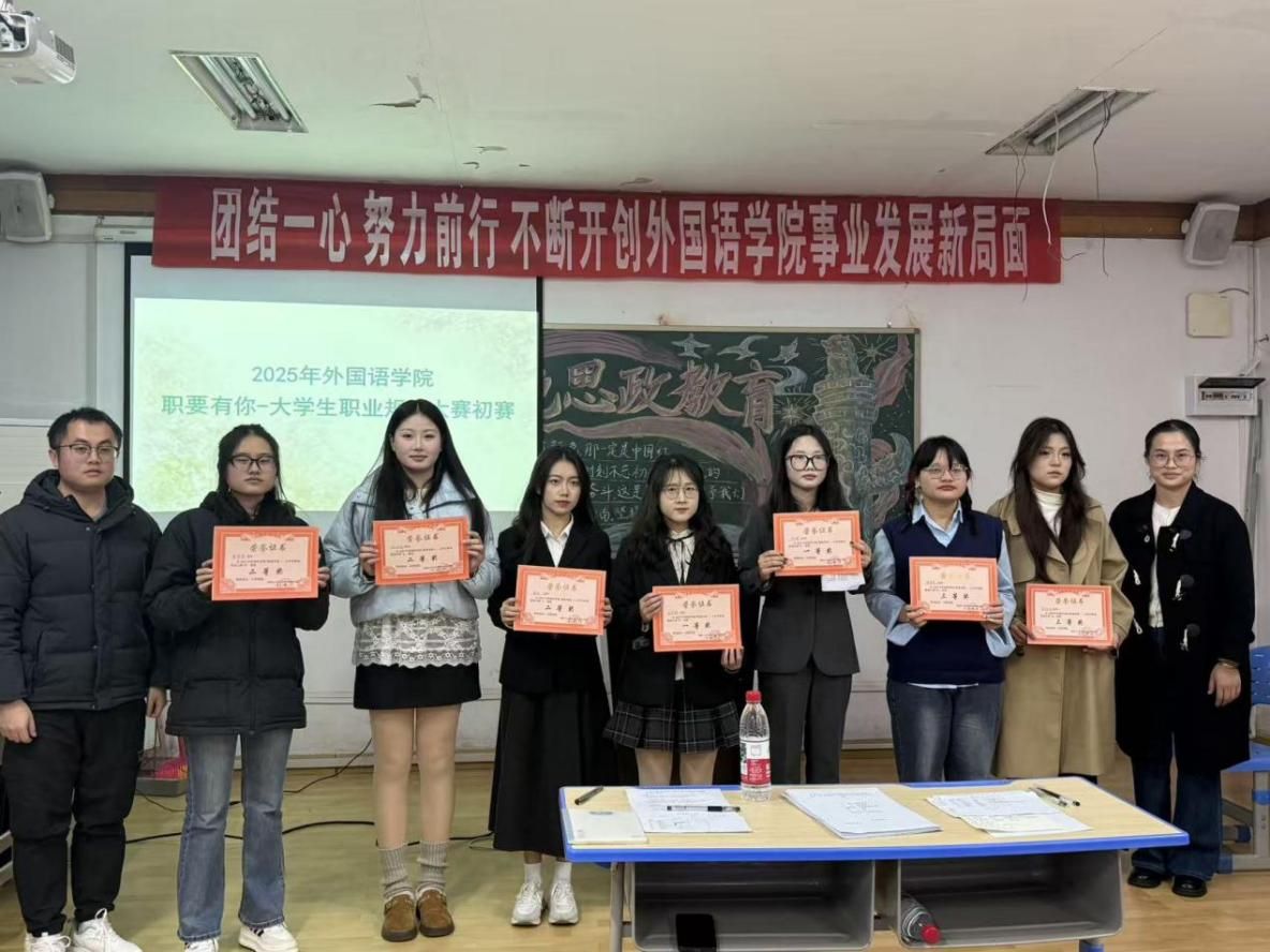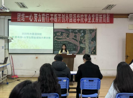 为引导学生树立科学的职业发展观念,提前规划职业生涯,2025年12月1日晚,外国语学院在播馨楼301教室举办了职要有你一大学生职业生涯规划大赛院赛。外国语学院学工办主任朱倩、团总支书记满英杰担任现场评委。