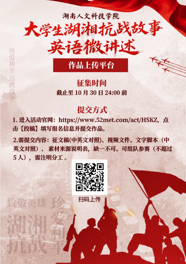 为纪念中国人民抗日战争暨世界反法西斯战争胜利80周年,深入贯彻落实习近平新时代中国特色社会主义思想和党的二十大精神,弘扬伟大抗战精神与爱国主义传统,2025年7月至10月,由湖南人文科技学院教务处主办,外国语学院与湖湘文化海外传播研究中心共同承办的“大学生湖湘抗战故事英语微讲述”大赛顺利举行并圆满落幕。