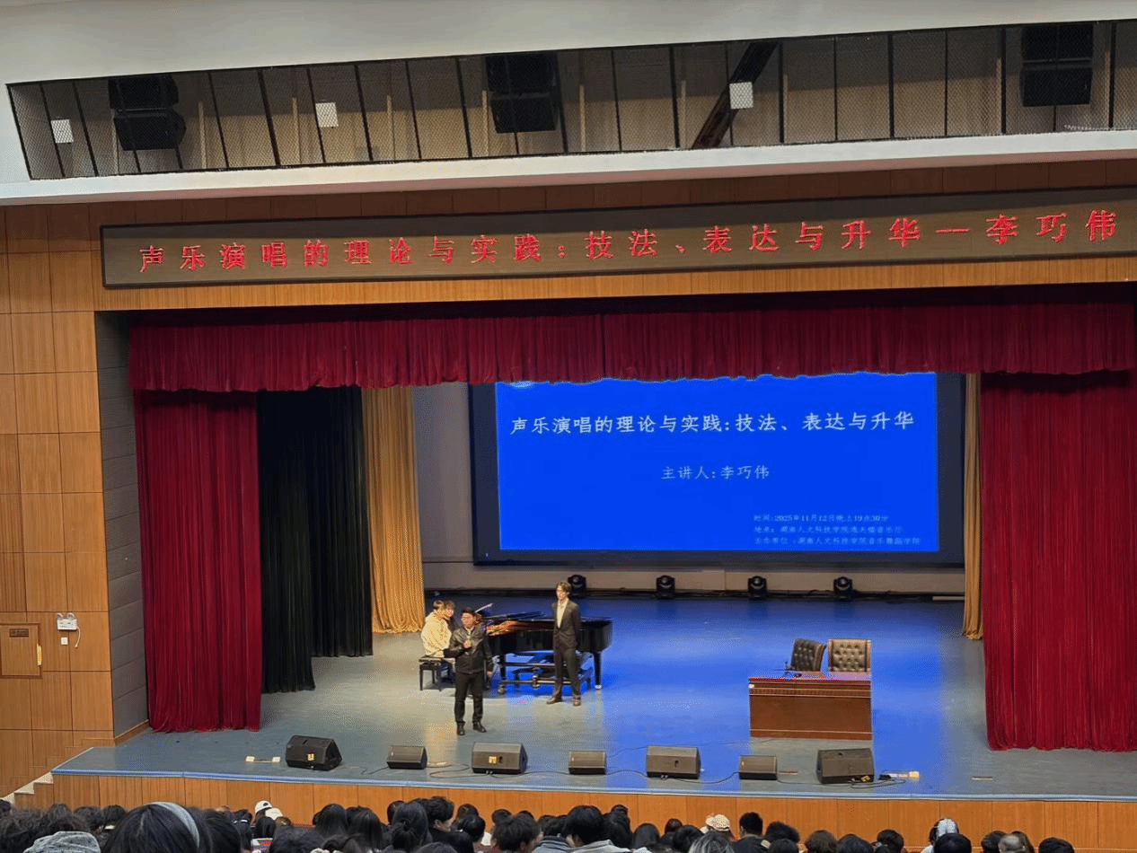 2025年11月12日晚上,长沙学院音乐学院院长李巧伟教授应邀赴湖南人文科技学院音乐舞蹈学院,于音乐厅开展了《声乐演唱的理论与实践:技巧、表达与升华》声乐教学讲座,本次讲座由音乐舞蹈学院院长刘利连主持,音乐舞蹈学院师生代表踊跃参与。