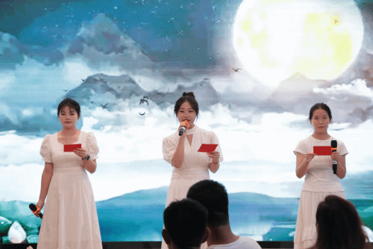 诗会在《诗词里的中国》的深情朗诵中拉开帷幕,朗诵者深情并茂,迅速将观众带入古典诗词的优美意境。整场演出共呈现十二个精彩节目,涵盖经典诗词朗诵、二胡独奏、古典舞蹈等艺术形式。音乐舞蹈学院唐博老师、教育学院张梅老师与罗斯琪老师、文学院的王文静老师与贺禧老师以及来自各学院学生代表及青莲文学社成员联袂登台。悠扬的乐曲、动人的朗诵与灵动的舞姿交织相融,会场气氛温馨而热烈,互动环节更是点燃了全场的参与热情,师生们在沉浸式的文化体验中,共同感受中秋的诗意与团圆之情。