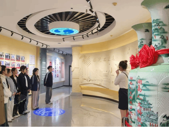 活动伊始,党员同志们便被入口处的石刻墙吸引,墙上复刻的湖南人文科技学院大门与致远楼栩栩如生,一旁的墙面镌刻着学校的发展脉络。沿着展区深入,展柜中陈列的老式教学器械、历任教师的工牌与泛黄的教学笔记等展品,无声地诉说着学校往昔的教学岁月;而在展区后方,阶梯式展台整齐排列的一座座荣誉奖杯,直观展现了学校在办学过程中取得的丰硕成果。从校史沿革到办学成就,从实物展品到荣誉见证,每一处细节都让学生党员同志们对学校的历史与底蕴有了更具象、更深刻的认知。